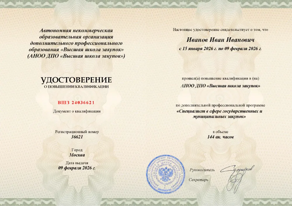 Вы получаете официальный документ о повышении квалификации. Высшая школа закупок (fz44.org) в обязательном порядке вносит сведения об обучении в Костроме в федеральный реестр ФИС ФРДО, подтверждая легитимность вашей подготовки перед контролерами.