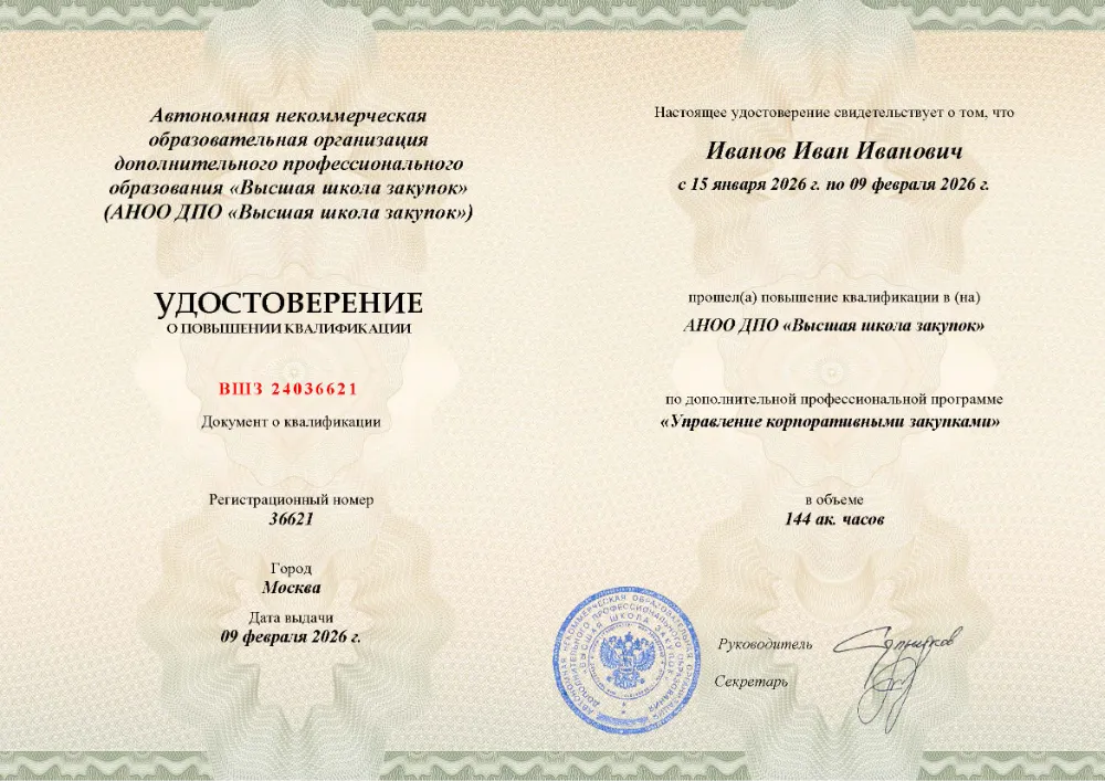 Вы получаете официальный документ о повышении квалификации. Высшая школа закупок (fz44.org) в обязательном порядке вносит сведения об обучении в Костроме в реестр ФИС ФРДО, подтверждая легитимность вашей подготовки перед контролерами.